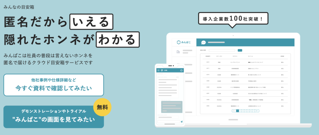 みんばこは社員の普段は言えないホンネを匿名で届けるクラウド目安箱サービスです