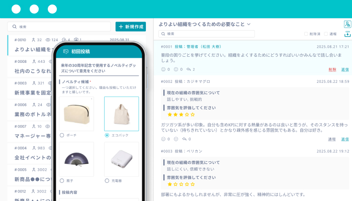 使いやすいくシンプルな画面設計により、日常の意見交換から重要な議論まで活用できます。立場に関係なく安心して発言でき、忖度のない意見が集まります。