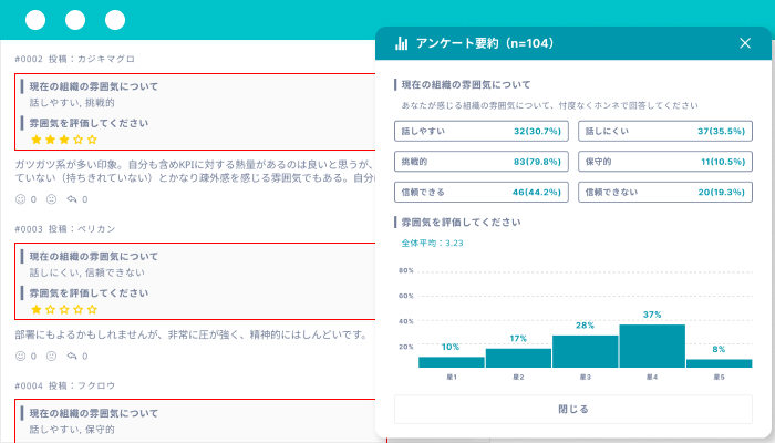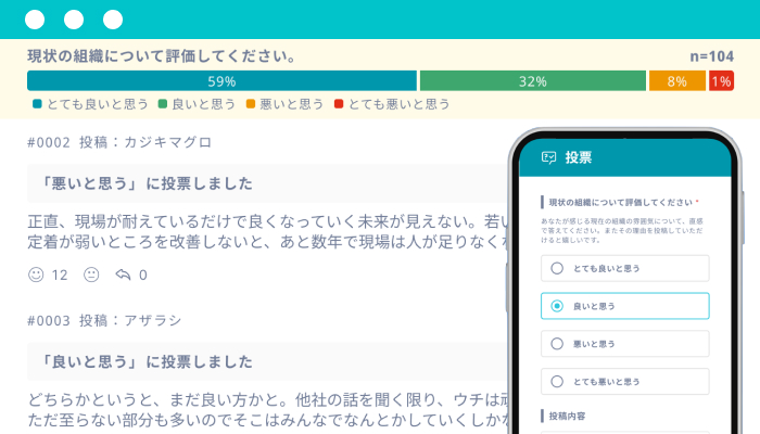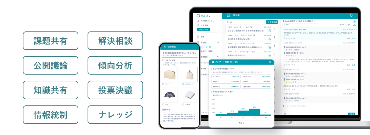 アンケートや投票機能で意見の傾向や多数派・少数派を可視化し、組織の課題解決と活性化をサポートします。