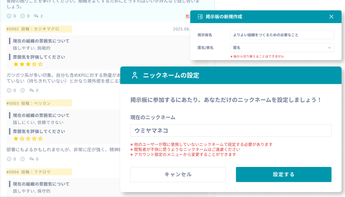 匿名投稿で上下関係のしがらみを抑え、率直な議論が活性化。小さな相談から重要テーマまで、継続的な意見交換を後押しします。参加ハードルも低減します。