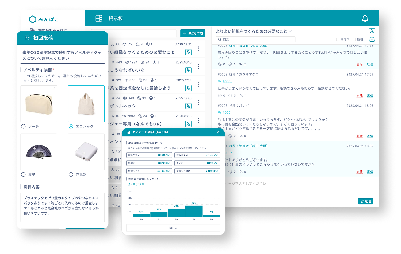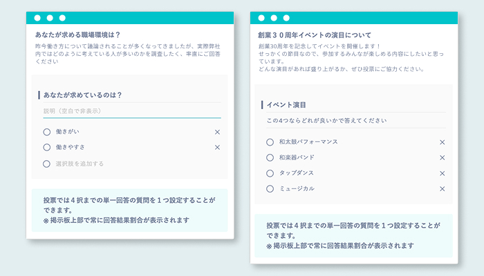 また意見交換にとどまらず、アンケートや投票を活用し、各従業員の思考を可視化することができます。集まった声をもとに課題の特定・改善施策などに活用でき、組織の課題解決と活性化をサポートします。